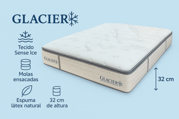 O Glacier Ice Látex é um colchão premium projetado para proporcionar conforto equilibrado e frescor duradouro. Com 32 cm de altura, ele combina uma camada superior em látex natural — que distribui a pressão do corpo com alta resiliência — com molas ensacadas individuais Comfort Core Extreme, garantindo suporte pontual e minimizando transferências de movimento.